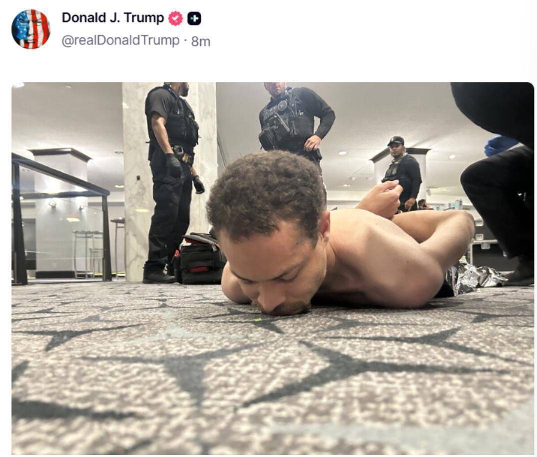 特朗普在社交媒体发布枪手被捕画面(央视新闻视频截图)